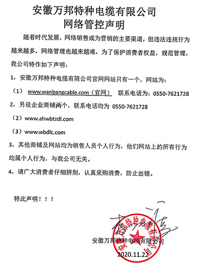 鄭重聲明:安徽萬邦特種電纜有限公司官方網站為:www_wanbangcable_com.jncyck.cn,除此之外無任何子網站或合作網站,其余均為假冒偽劣。電話:0550-7621728 13485756353 地 址:安徽省天長市滁州高新技術產業開發區經四路29號